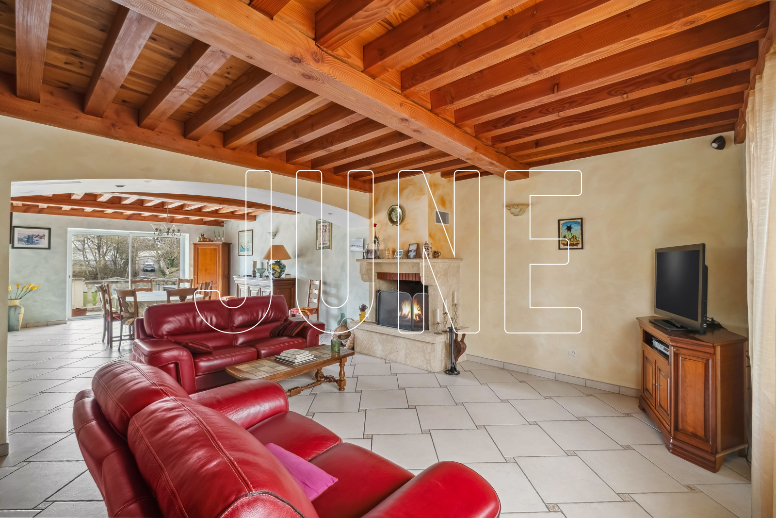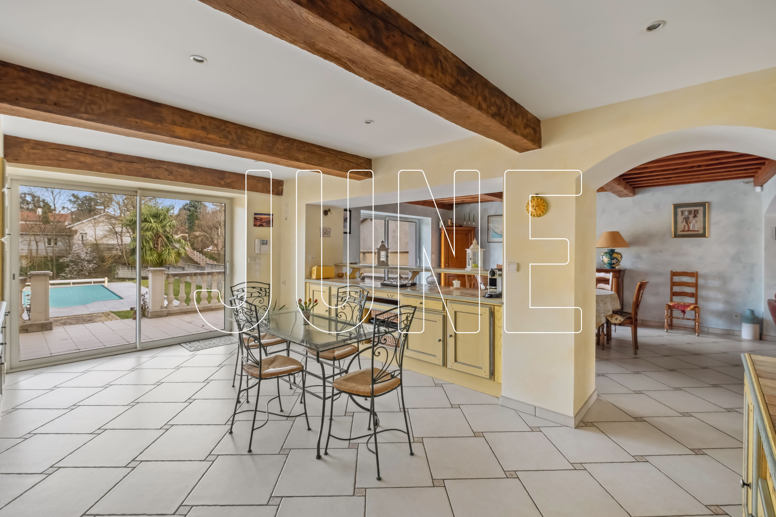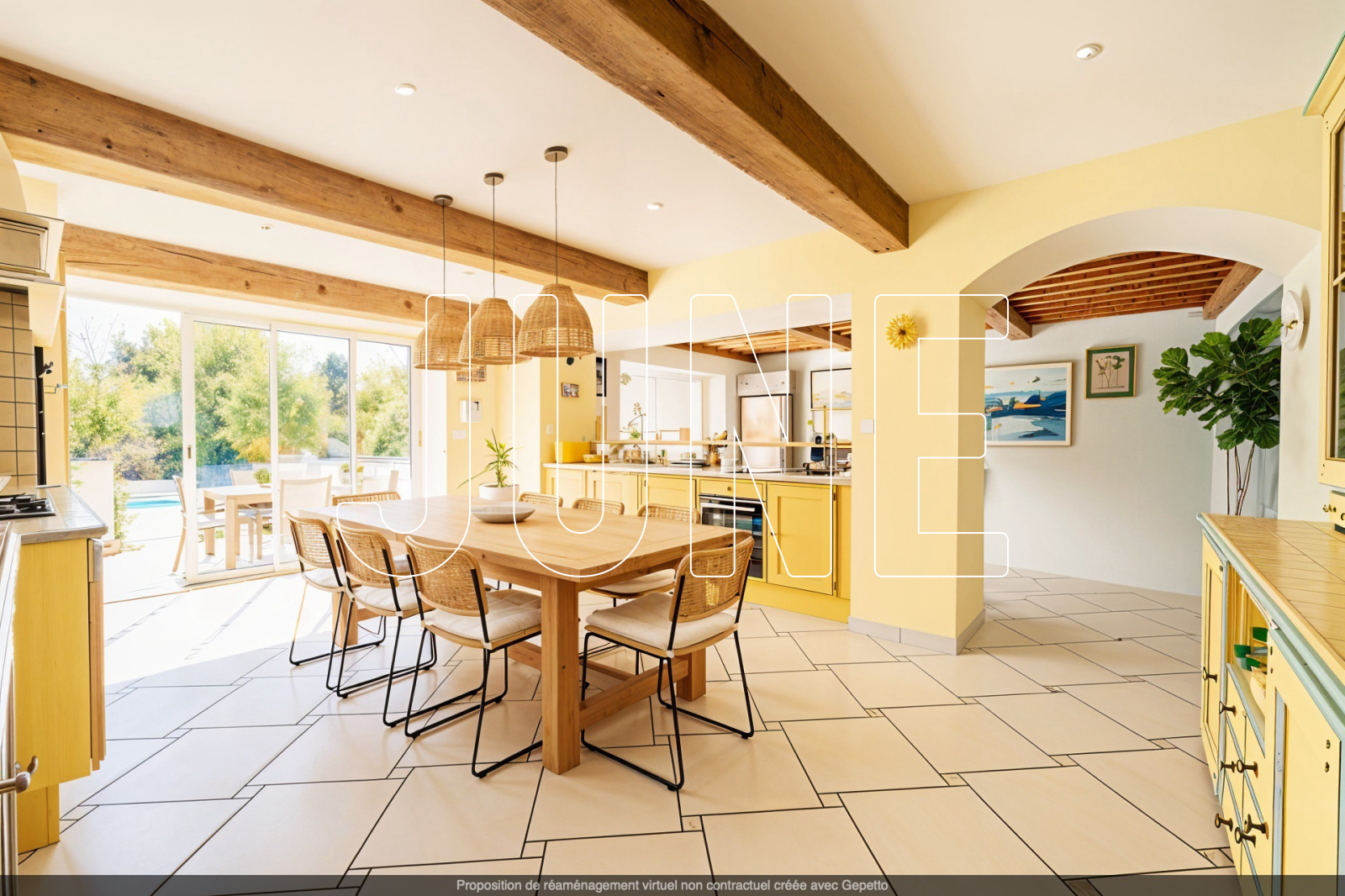 Dès l’entrée, le charme opère avec une vaste pièce de vie de 66 m², baignée de lumière et ouvrant sur une agréable terrasse de 24 m² avec vue imprenable sur la piscine et son écrin de verdure. Pierres apparentes, poutres et matériaux nobles confèrent à cette maison une âme unique.