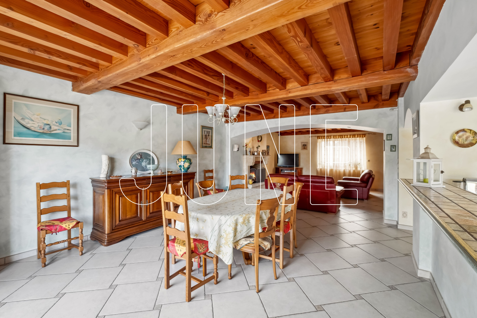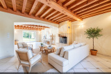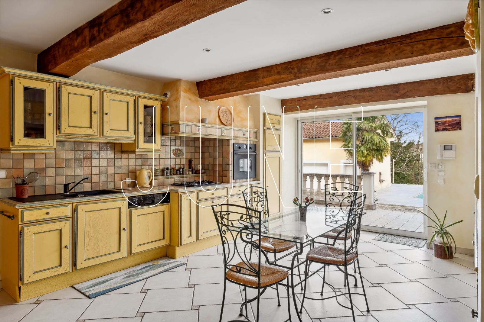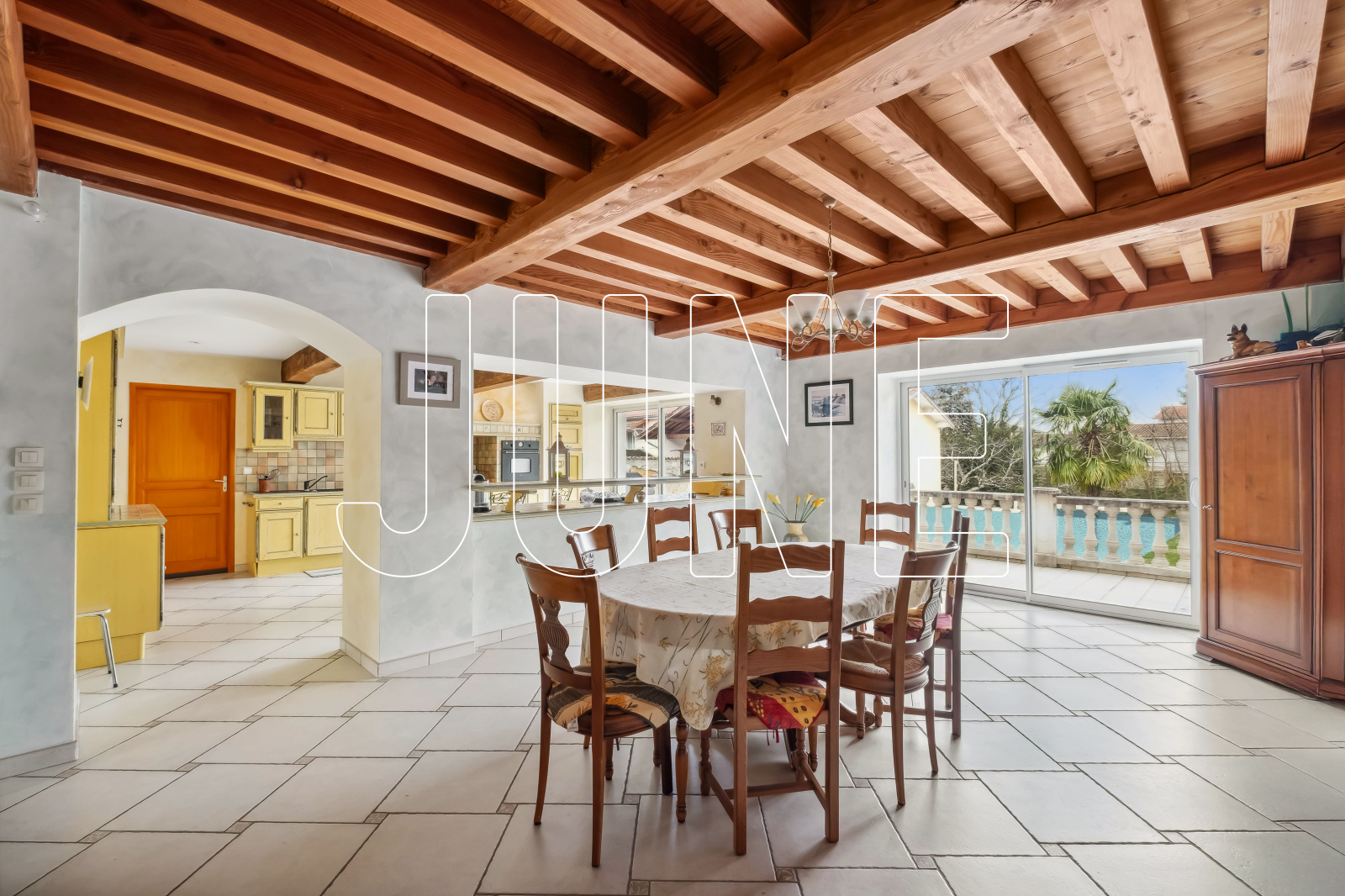 Dès l’entrée, le charme opère avec une vaste pièce de vie de 66 m², baignée de lumière et ouvrant sur une agréable terrasse de 24 m² avec vue imprenable sur la piscine et son écrin de verdure. Pierres apparentes, poutres et matériaux nobles confèrent à cette maison une âme unique.