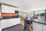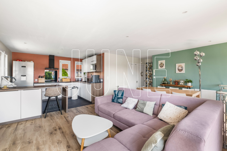 Sur un joli terrain plat et arboré de 750 m², vous trouverez au 1er étage une belle pièce de vie de 38 m² comprenant un séjour lumineux et une cuisine ouverte récente, entièrement équipée, bénéficiant d'une belle luminosité grâce à ses nombreuses ouvertures et à une large baie vitrée donnant accès au balcon.