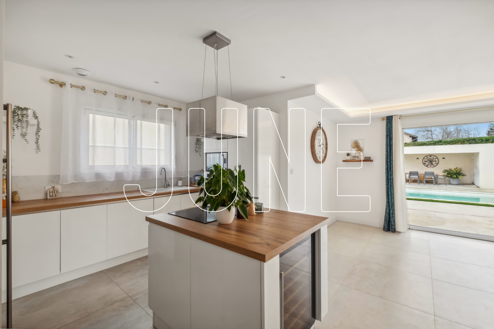 Au RDC vous trouverez en premier lieu une entrée avec placard intégré, puis une très belle pièce de vie de plus de 50m2 avec sa cuisine ouverte équipée. Depuis cet espace, vous aurez accès au jardin donnant accès à l’espace terrasse, piscine et son pool house.