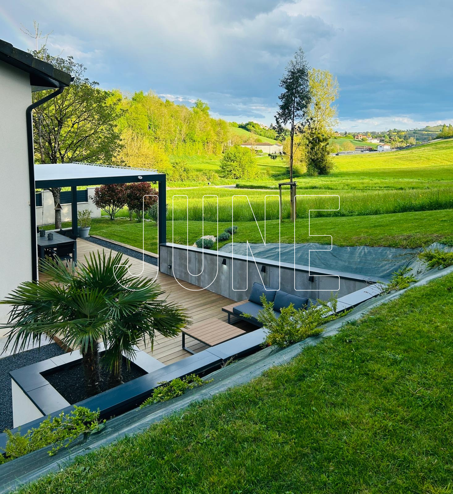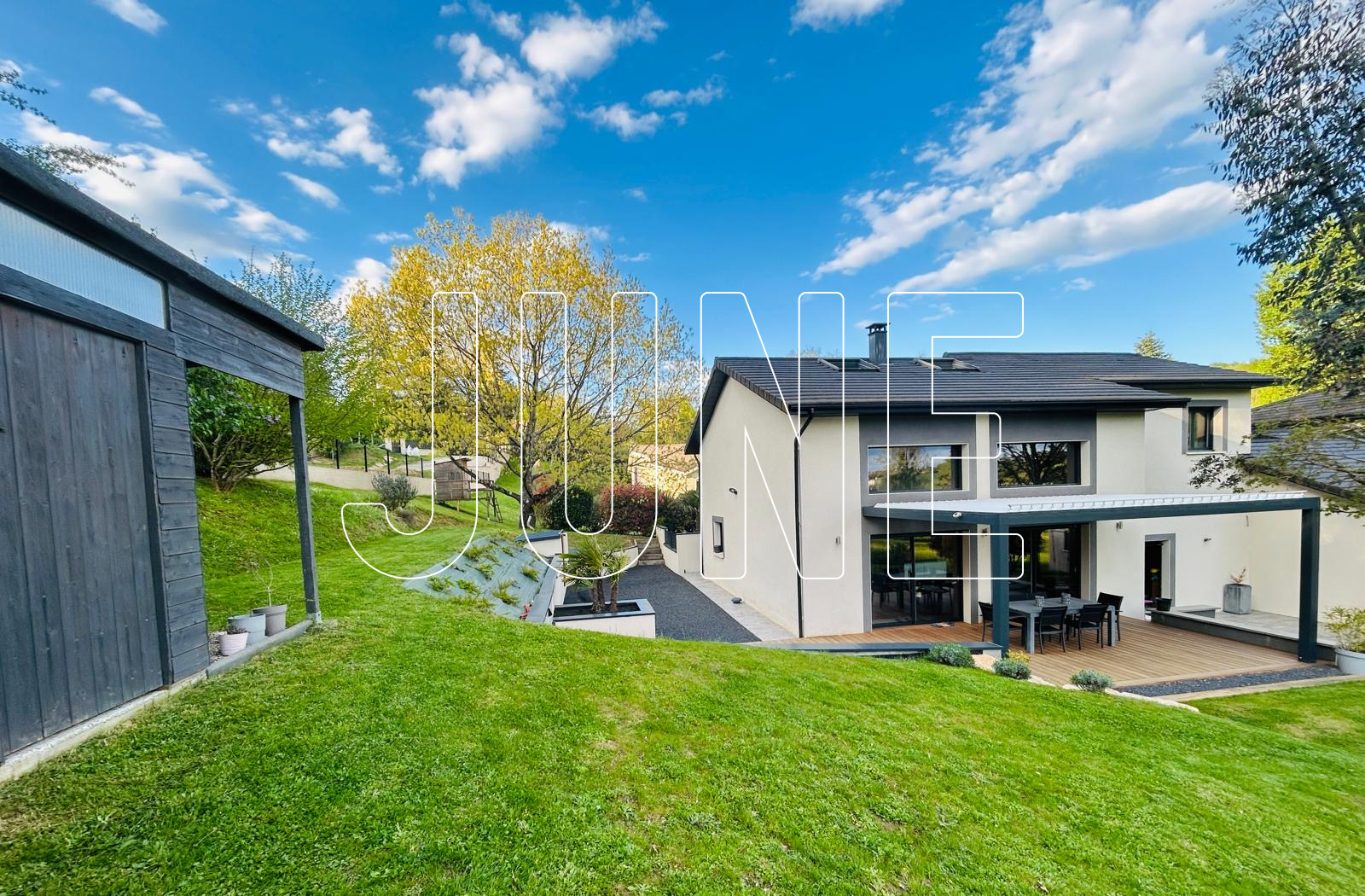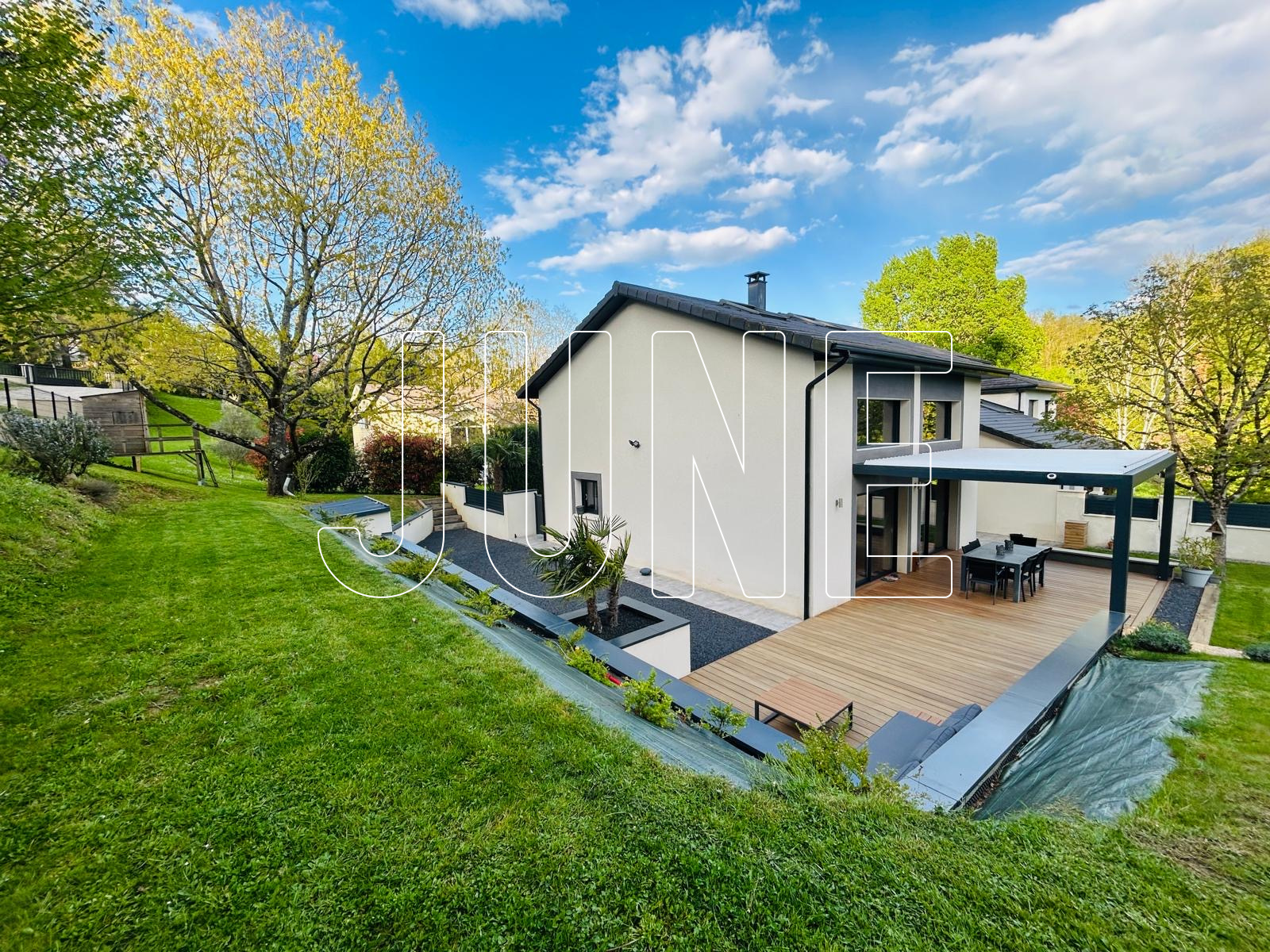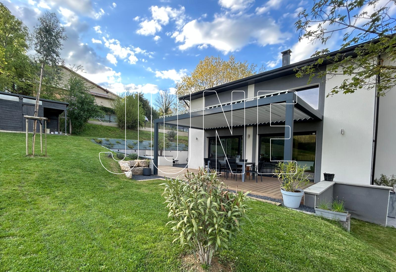 À l’extérieur, les aménagements ont été soigneusement pensés : terrasse en bois exotique avec pergola bioclimatique, abri de jardin et plusieurs espaces terrasses permettant de profiter de chaque moment de la journée.
