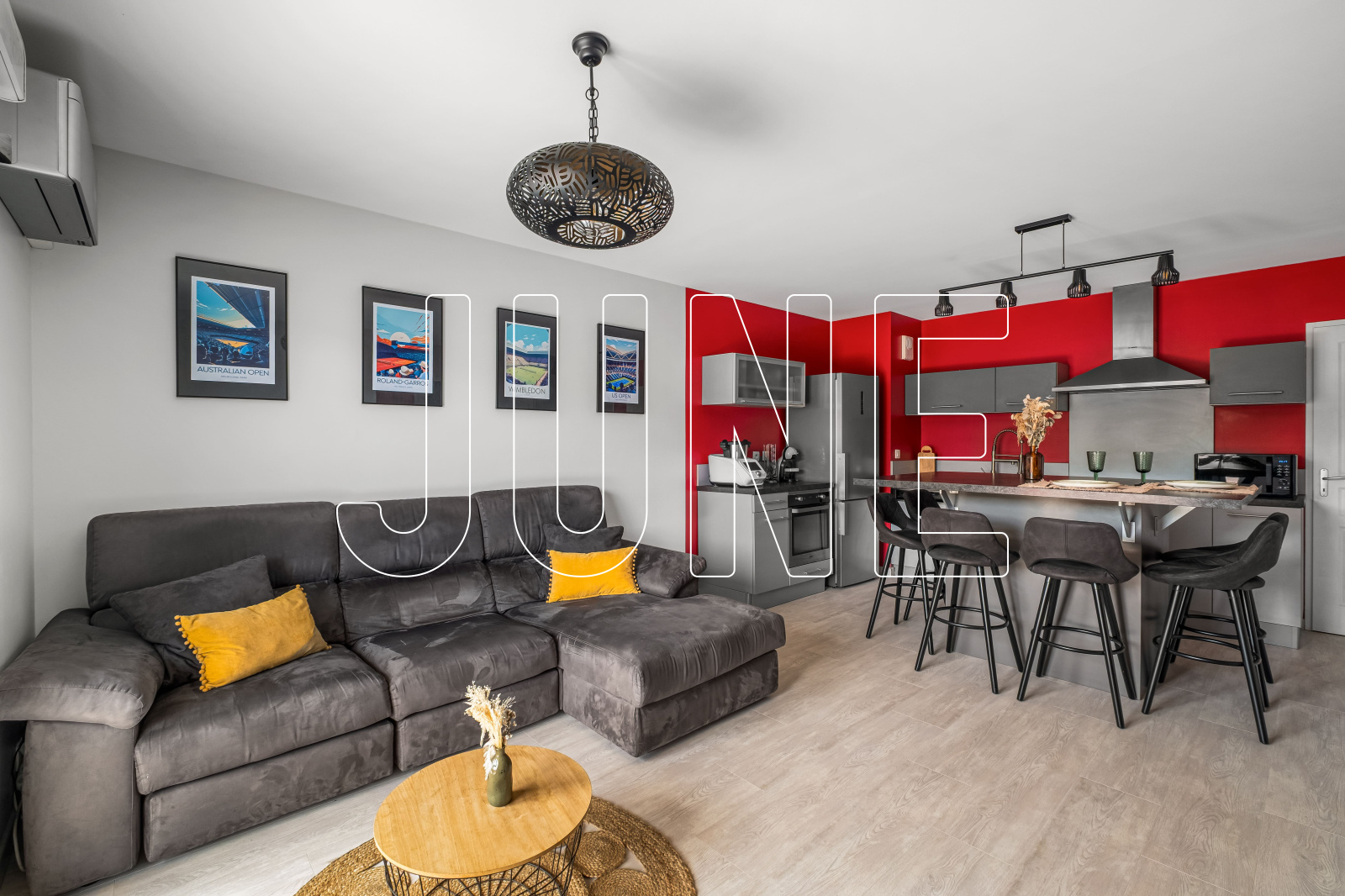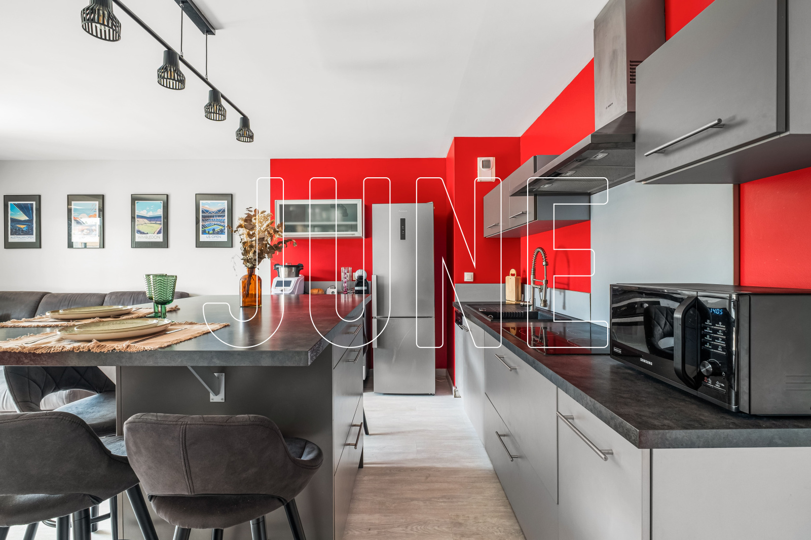 Vous accéderez à ce bel espace extérieur directement depuis la pièce de vie près de 26m2 exposée plein sud, avec cuisine ouverte aménagée et équipée.