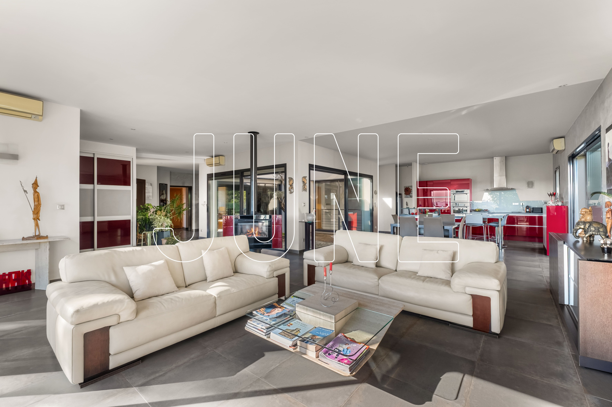 La pièce de vie d’environ 70m2, avec cuisine ouverte équipée est baignée de lumière grâce à de grandes menuiseries (en aluminium).