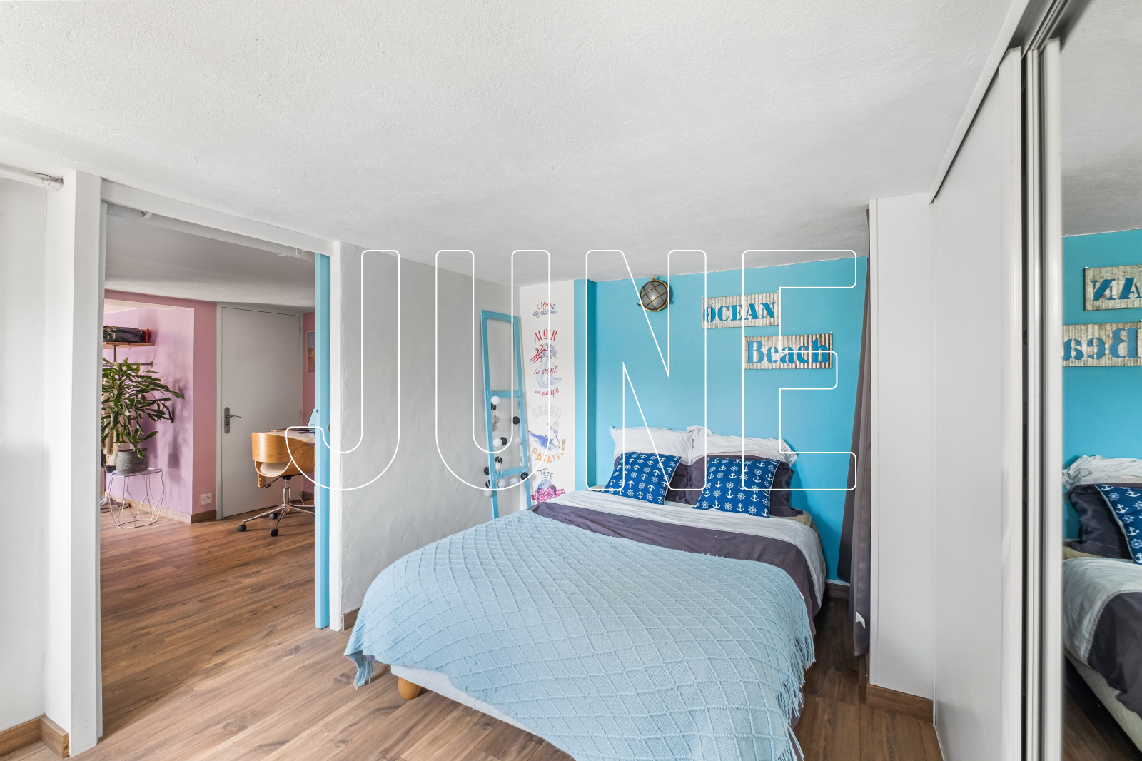 Sur ce même niveau, deux chambres (9 et 14 m² environ), dont une avec un grand placard intégré, ainsi qu’une salle d'eau avec WC.