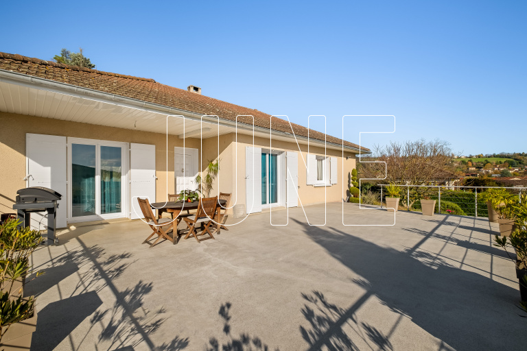 À l’étage, la pièce de vie séduit par sa luminosité et ses volumes généreux avec sa cuisine ouverte moderne d’une surface totale d’environ 52 m² donnant directement sur une superbe terrasse offrant une vue dégagée sur le jardin.